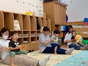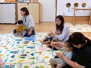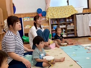 リトミックが始まるとピアノの音に合わせてお部屋をお散歩…。公園に到着するとママの抱っこのブランコに二拍子~三拍子~とリズミカルに揺られお友だちもニコニコ。その後もママのお膝のお船に乗ったり、スカーフで花火を作って遊んだり、タンブリンやトライアングルを曲に合わせてたたいたり…。お母様にもたくさんご協力いただき色んなの音を聞き、音を重ねた音楽の楽しさを全身で味わうことが出来ました。