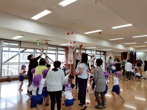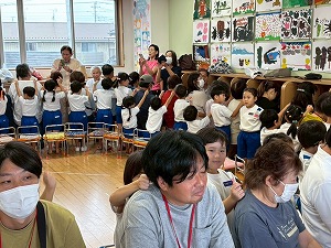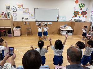 年少・年中さんは“おてらのおしょうさん”“にんじんじゃがいも”の手遊びや“肩たたき”のお歌で触れ合い遊びをしたり、年長さんは触れ合い遊びを行ったり、ホールでスポーツの先生も一緒に玉入れを行い楽しみました。全学年「ずっとずっとずっと」のお歌の発表や心を込めて作ったプレゼントを渡すこともでき、子どもたちからもお家の方からも笑顔が溢れる素敵な時間となりました!