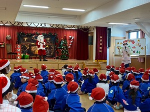 クリスマス飾りがされたホールに入ると、いつもとは違う雰囲気にワクワクドキドキする可愛らしい子どもたち。舞台の上には大きな椅子が置いてあり「誰の椅子だろう?」「大きいよね!」と話をしていると、どこからか鈴の音が…トロンボーンを吹きながら愉快に登場したサンタさん!