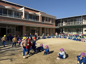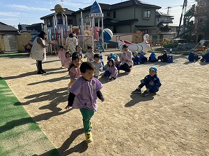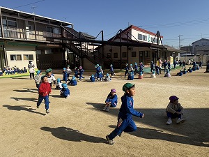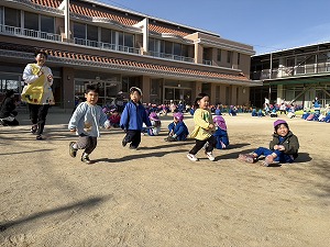 年長さんが走りやすいようにトラックを作ってくれて、その周りを各学年ごとに元気に走りました。