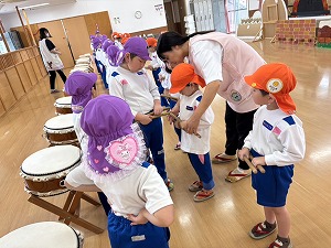 年長さんも太鼓の約束事や叩き方を手取り足取り丁寧に、優しく教えてくれて、引継ぎ会が終わった後には「楽しかった!もっとやりたい!」と満足そうな表情を浮かべていた年中さんです。