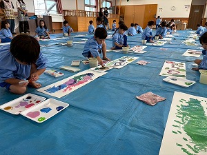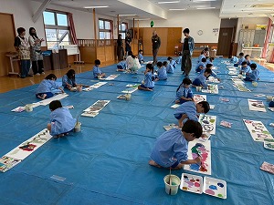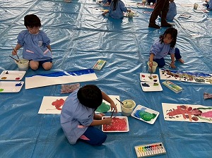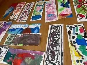 子どもたちは初めての造形レッスンにドキドキワクワク!導入では長い紙に興味を持ち、しお先生ともも先生のお話を楽しそうに聞きながら、「早く描きたい!」「長い電車が描けそう!」等、どんな絵を描こうかと想像を広げていました。はじめは大きな紙に緊張していたお友だちも、絵の具をたっぷりと使い、2枚目3枚目を描くほどのびのびと楽しむことができました。