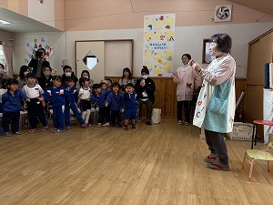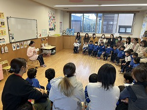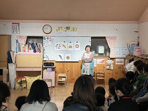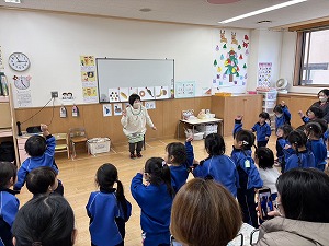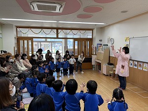 そのあとのとても楽しみにしていたはるみ先生の英語では、振り付きでノリノリで歌っていた子どもたち。ドキドキした気持ちもある中、可愛らしい笑顔も見られ、楽しい時間となりました。