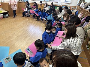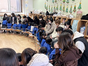 始めは緊張していた子どもたちでしたが、お家の方の姿が見えると、徐々にいつもどおりの笑顔が戻ってくる様子がありました。おはじまりではいつもの姿を見ていただき、頑張って覚えためばえかるたなどをかっこよく披露することができました。