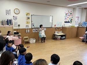 そのあとのとても楽しみにしていたはるみ先生の英語では、振り付きでノリノリで歌っていた子どもたち。ドキドキした気持ちもある中、可愛らしい笑顔も見られ、楽しい時間となりました。