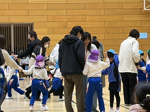 そのあとはジャンケン玉入れをお家の人と一緒に楽しみました。お家の人と手を繋ぎながら、嬉しそうにゲームに参加する姿が微笑ましかったです!