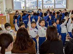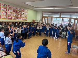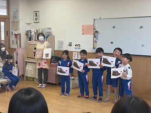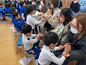 さすがの集中力と良い姿勢で年長さんらしさを見せてくれたおはじまり。ジングルベルのお歌は、各クラス話し合いをして子どもたちが決めた振りを付けながら楽しく披露してくれました。お家の方の前で少し恥ずかしそうにする姿も可愛らしかったです。英語遊びでは、大好きなはるみ先生のお話をよく聞きながら、普段通りリラックスして臨んでいた子どもたち。アルファベットの発音を学ぶ発音体操や、会話のように声に出して楽しむぐるぐるチャンツ、可愛らしいペンギンダンスに、『ねこのピート』のお話に合わせてそれぞれ色塗りをしたスニーカーを持って、お友だちと一緒にお歌や踊りを楽しむことができました。お家の方とのふれあい遊びではあちらこちらから笑い声が聞こえ、素敵な時間を過ごしていただけたのではないかと思います。