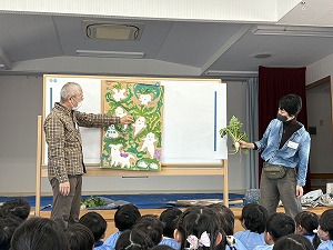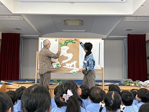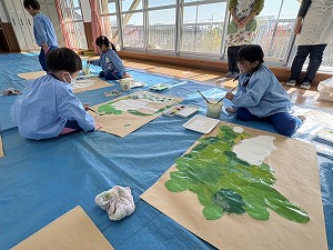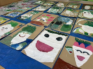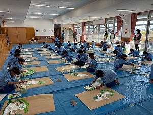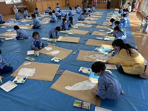 今回のテーマは「大根」です!本物の大きな大根を見ながら、しお先生ともも先生が楽しいお話をしながら描いて見せてくれました。「大根が動いてるみたい!」「早くやりたい!」など様々な声が聞こえてきて、描き始めると、「これはお風呂に入ってるところ!」「大根の葉っぱの滑り台だよ!」など想像を膨らませながら、いつもよりも大きな紙にたっぷり絵の具を使いダイナミックな作品に仕上がりました。