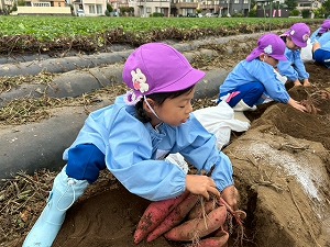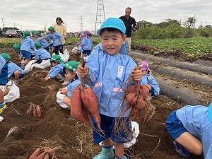 川越市にある『あらはた園』さんに到着すると、「掘るぞー!」と気合い十分で掘り始め、次々出てくるさつまいもに目を輝かせていました。子どもたちの掘るスピードが昨年より速く、年中さんの頃からの成長を感じました。袋いっぱいのさつまいもを一生懸命自分の力で、とても嬉しそうに運ぶ姿が可愛らしかったです。