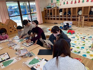 先週に引き続き本日もクリスマスの記念制作「ペタペタアート✰」を行いました。今日の対象は1~2歳児さん。
