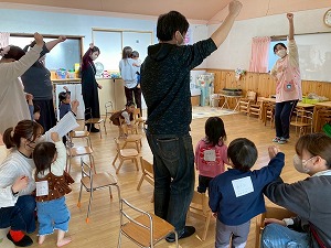 お名前呼びではニコニコの笑顔のお返事とともにサンタクロースさんとタッチ!その可愛いお手々でみんなで手遊びをしたり、全身を動かしてアンパンマン体操をしたり…制作に入るまでのお時間も楽しく元気いっぱい♪でした!