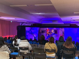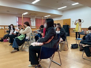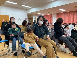 お母さんの温かいお膝の椅子に座り劇に見入るお友だち。可愛い雪だるまさんが出てくるとお母さんと顔を見合わせ喜んだり、声を出して笑ったり…。微笑ましいお友だちの姿にも先生は見入ってしまいました♪