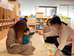 今日のお友だちのお手伝いは可愛い手形足形を取ること…。それもとっても上手に取らせてくれて後はお母様にバトンタッチ!
