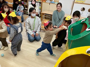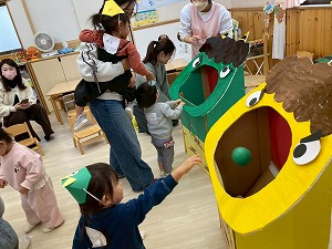 ‘’おにはーそと!ふくはーうち!‘’真剣に鬼さんにめがけて大豆ボールを投げてくれたお友だちのお陰で、先生たちもいつもの笑顔に戻りましたね♪