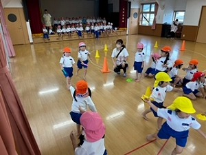 年中さんは憧れのバトンを使ってリレーを行い、年長さんの負けないくらい素晴らしい走りを見せてくれました。