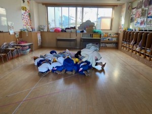 2023.11.13 3歳児 4歳児 5歳児 避難訓練 本日は地震を想定して避難訓練を行いました。 地震の放送が聞こえると、子どもたちは素早く座布団を被り落ち着いて避難をすることが出来ました。 また、トイレに行っている時に地震が起きたらどうしたらいいのか等、各クラス話し合いを行い、理解を深めることも出来ました。 今後も様々な事を想定して訓練を行っていきたいと思います。 « 古い記事 一覧へ 新しい記事 »