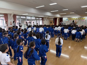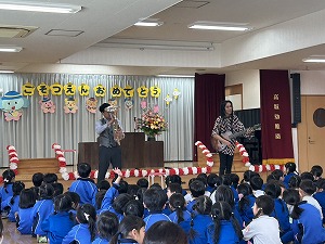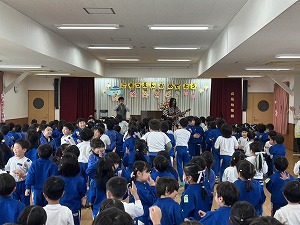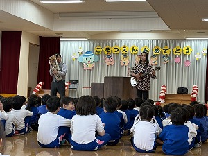 2026.03.16 3歳児 4歳児 5歳児 音楽会♪ 本日はEverly(エバリー)さんというグループが、幼稚園に楽しい音楽を演奏しにきてくださいました! ギターやユーフォニアムという楽器を持って演奏したり、歌をうたったり、実際にお友だちにギターを触らせてくれたり…! みんなでノリノリで身体を動かしながら、音楽に合わせて踊りや歌を一緒に楽しみました♪ 素敵な音楽を聴きながらみんなで楽しい時間が過ごせて大満足の子どもたちでした。 « 古い記事 一覧へ