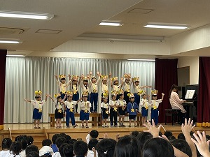 ピカピカの冠とメダルを身に付け舞台の上に上がった子どもたちは、たくさんのお客さんの前でドキドキしながらも緊張をパワーに変えてニコニコ笑顔で素敵な姿を見せてくれました。お家の方にかっこいい姿を見てもらえて誇らしげな表情でした!