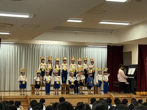 ピカピカの冠とメダルを身に付け舞台の上に上がった子どもたちは、たくさんのお客さんの前でドキドキしながらも緊張をパワーに変えてニコニコ笑顔で素敵な姿を見せてくれました。お家の方にかっこいい姿を見てもらえて誇らしげな表情でした!