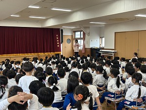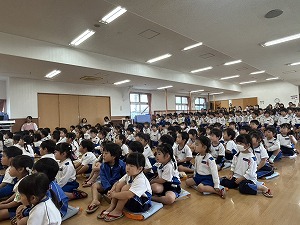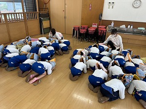 お楽しみ会終了後、ホールでの避難訓練を行いました。万が一、ホールで地震が起きたときのことをみんなで考え、実際に防災頭巾を素早く被り、担任の先生のところに集まる練習をしました。