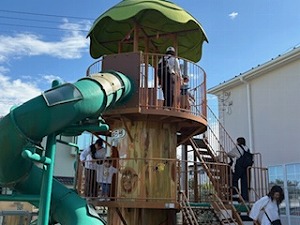もう何度も遊びに来てくれているお友だちは、きらきら号の3階から下りるトンネルの滑り台もニコニコ♪少し前は怖がっていたのに…すごいな…と。この高坂幼稚園の園庭がお友だちにとって安心した楽しい場所になっていることを実感しとっても嬉しく思いました。