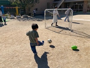 大人気のお砂場ではお山を作ったり、高坂号のローラー滑り台、サッカー等など園庭をのびのびと使って遊び込んでくれたお友だち。
