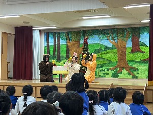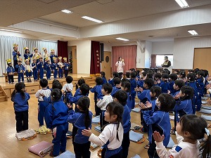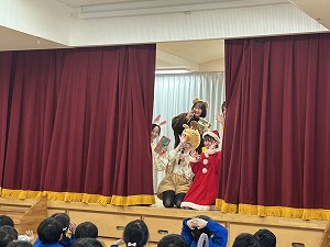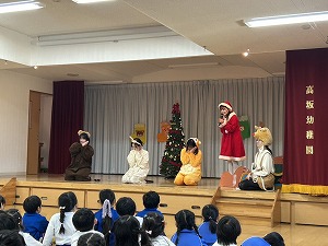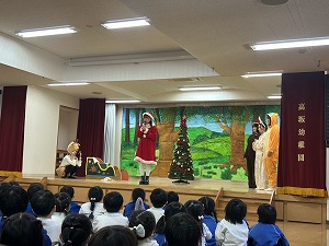 その後のお楽しみ会は職員による、クリスマス劇が行われました。 動物になりきった先生たちがでてくると嬉しそうな表情で、どうしてトナカイさんのお鼻は赤いんだろうと一緒に考えながら楽しんでいました。サンタちゃんから「みんなのところにはサンタさんがプレゼントを届けに来てくれるからね!」と言われると大喜び!クリスマスの日が待ち遠しく、さらに楽しみになった子どもたちでした!